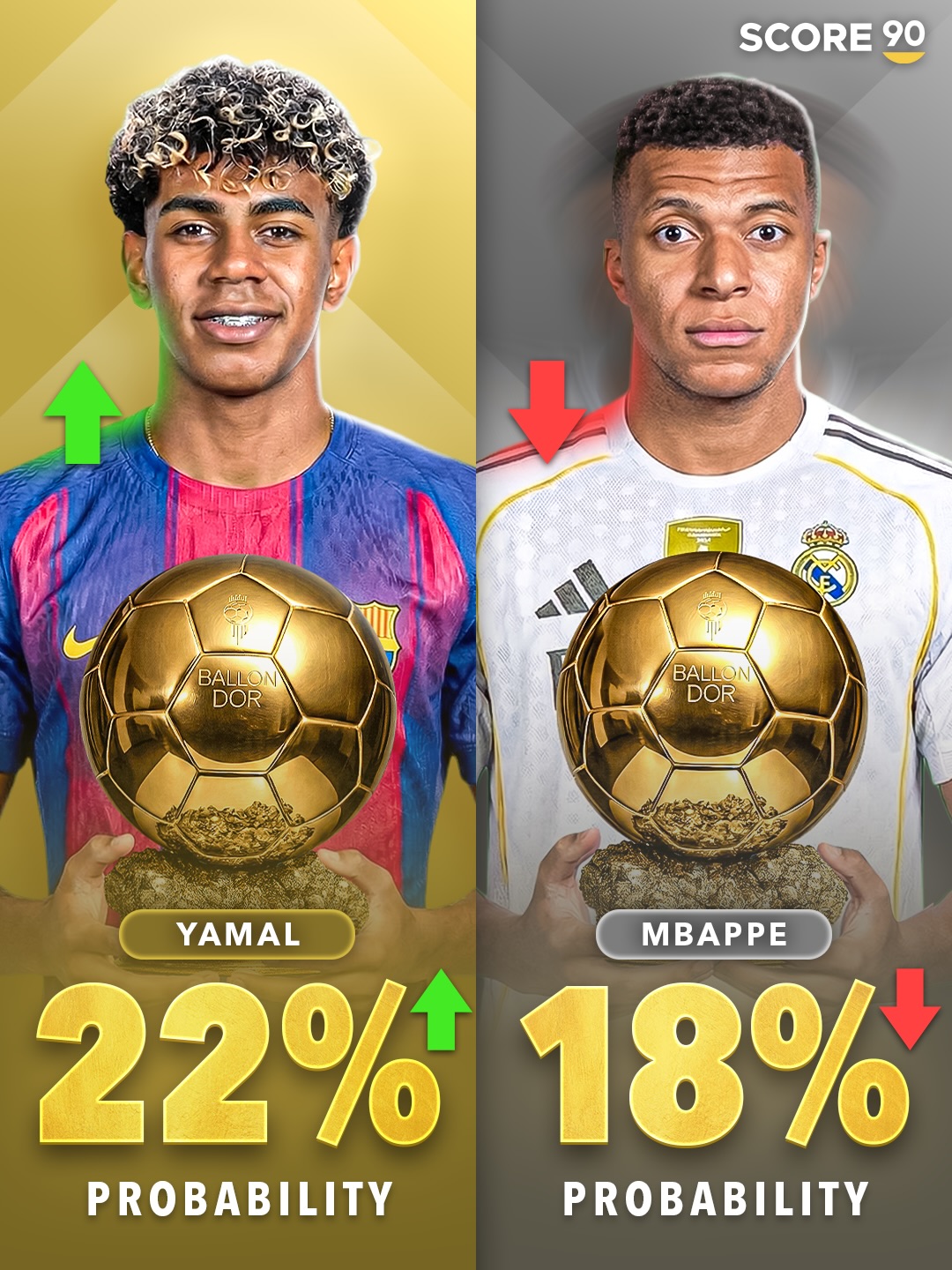 03月11日讯 外媒score90近日根据相关机构赔率,更新了今年金球奖的获奖概率,姆巴佩的获奖概率下跌到18%,而巴萨小将亚马尔则上涨到22%。