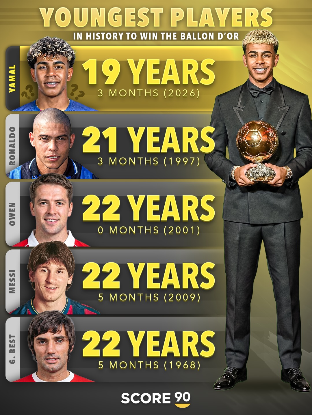 巴萨小将亚马尔目前18岁,如果他获得今年金球奖,将以19岁3个月的年龄成为历史上获得金球奖最年轻的球员。